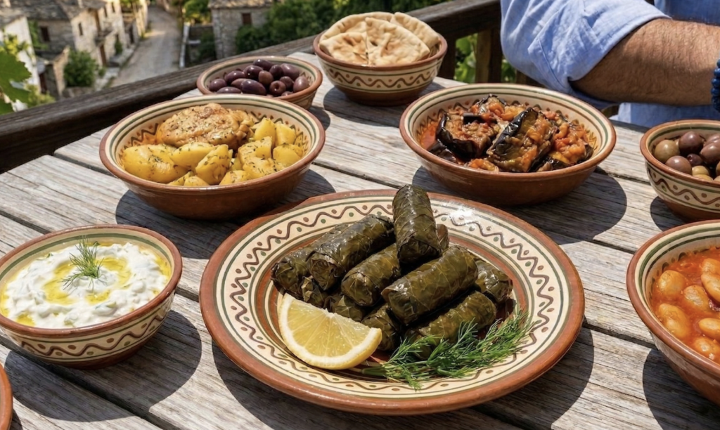 Select a large, flat vessel. A light-colored wooden board or a white marble slab is ideal for spring. It allows the greens of the vine leaves and the reds of the tomato-based dishes to stand out.