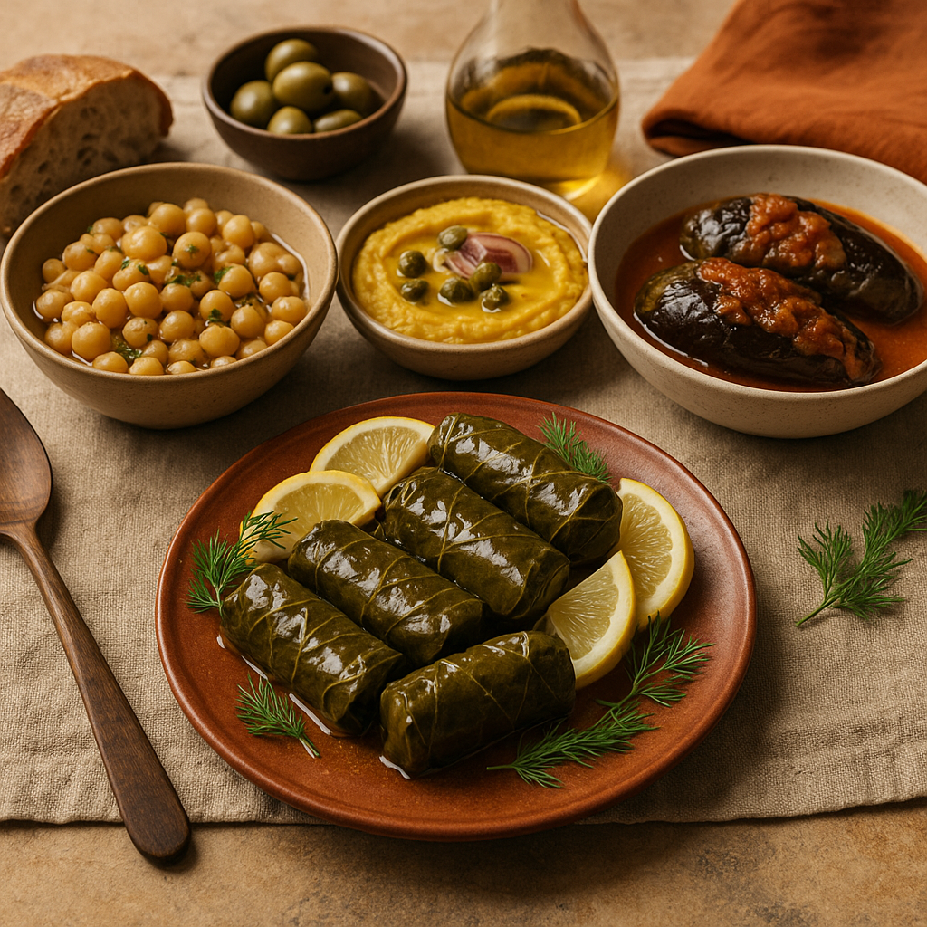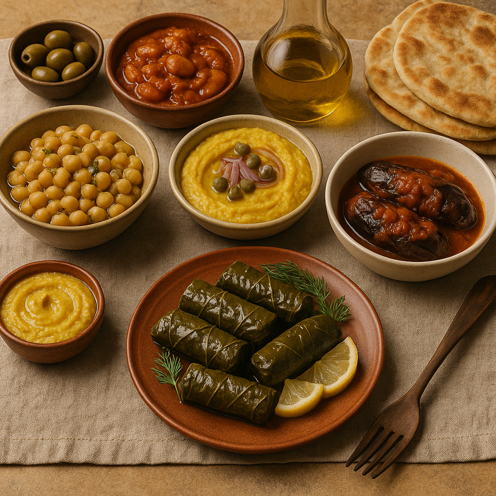 Greek holiday menus vary by region, but several flavors appear in almost every home. Many of these dishes are naturally plant-based and rooted in simple Mediterranean ingredients — olive oil, herbs, tomatoes, legumes, vine leaves, vegetables, and citrus.