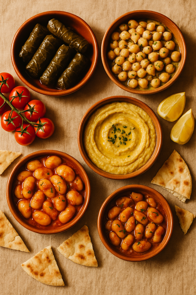 • Plant-Based Protein: From beans, chickpeas, and stuffed vine leaves.