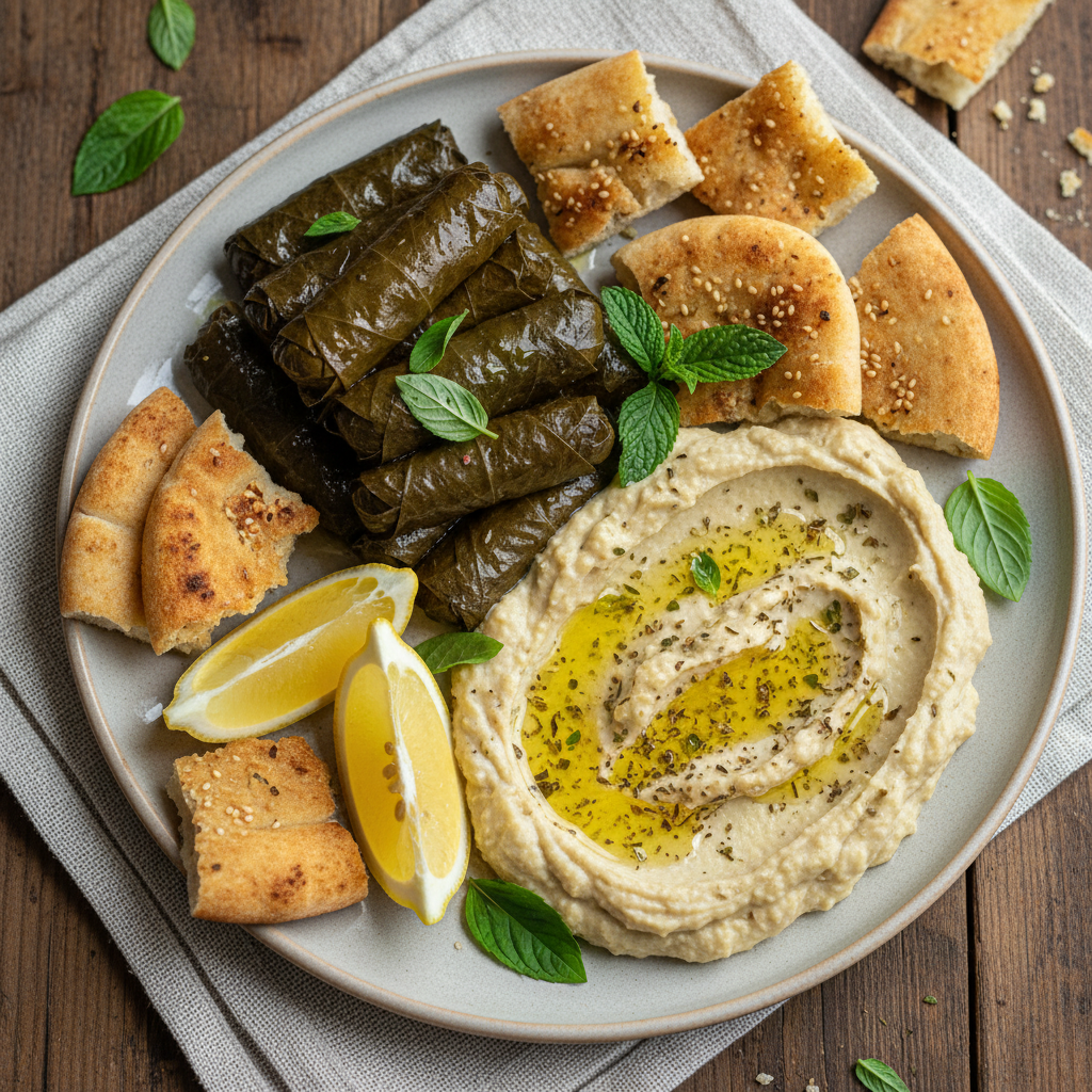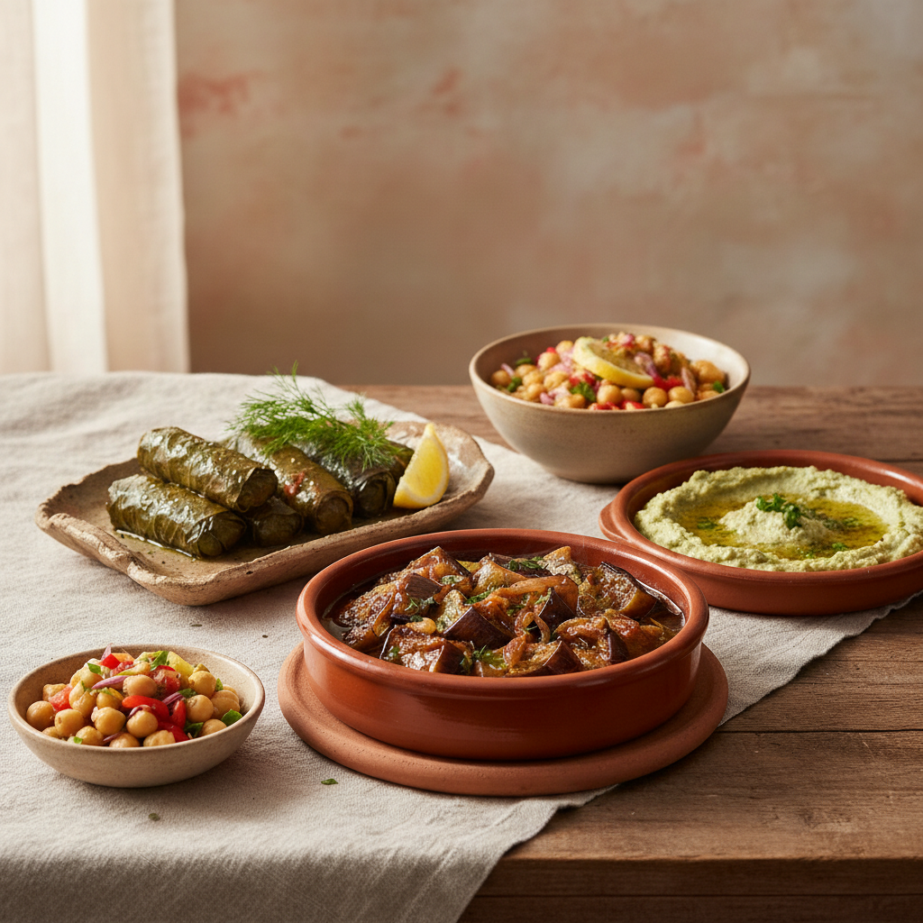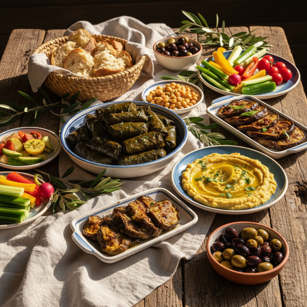Brightness is essential in mezze. Lemon, vinegar, herbs, and olive oil keep the spread lively and balanced.