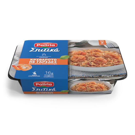 Το Κριθαρότο με γαρίδες Paliria αποτελεί μια θαλασσινή παραλλαγή του «γιουβετσιού» – μόνο που σ’ αυτήν, το υψηλής ποιότητας κριθαράκι βράζει μέσα στη σάλτσα τομάτας ώσπου να χυλώσει, με την κλασική μέθοδο προετοιμασίας του ριζότου. Όσο για την πεντανόστιμη σάλτσα τομάτας, αποκτά μοναδική γεύση χάρη στις γαρίδες, το ούζο, το έξτρα παρθένο ελαιόλαδο και τα μυρωδικά που περιέχει, πλημμυρίζοντας τις αισθήσεις με άρωμα από θάλασσα. Το καλύτερο όμως είναι ότι για το Κριθαρότο με γαρίδες δεν χρειάζεται να κάνετε τίποτε άλλο, εκτός από το να το απολαύσετε! Όλα τα άλλα τα έχει κάνει με μεράκι και φροντίδα η Paliria, δημιουργώντας το τέλειο γεύμα, συσκευάζοντάς το σε ατομικές μερίδες, στις υπέρ-χρηστικές ατομικές συσκευασίες «τάπερ» που μπαίνουν κατευθείαν στο φούρνο –κλασικό ή μικροκυμάτων-για να ζεσταθούν και να περάσουν στο τραπέζι!